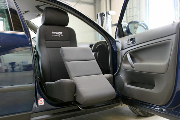 Der Sitz befindet sich „neben“ dem Fahrzeug, wodurch der Transfer beispielsweise vom Rollstuhl auf den Sitz wesentlich leichter ist.